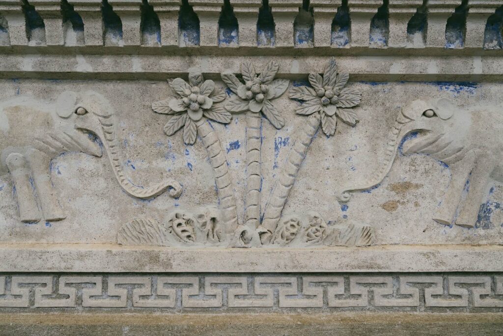 - 二樓外廊更顯匠心:中央為老鷹、飛馬、地球圖騰,兩側則有鳥、馬與棕櫚樹,將南洋風光凝縮於牆面。